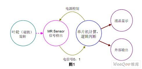 該方案的工作原理為:在葉輪上裝上磁鐵,由磁場(chǎng)感應(yīng)器(MR Sensor)感知出葉輪的旋轉(zhuǎn)。磁場(chǎng)感應(yīng)器(MR Sensor)把磁場(chǎng)信號(hào)轉(zhuǎn)變成電信號(hào),再由單片機(jī)進(jìn)行計(jì)量的加法或減法運(yùn)算,運(yùn)算值由液晶顯示或?qū)ν獠枯敵。如圖1所示